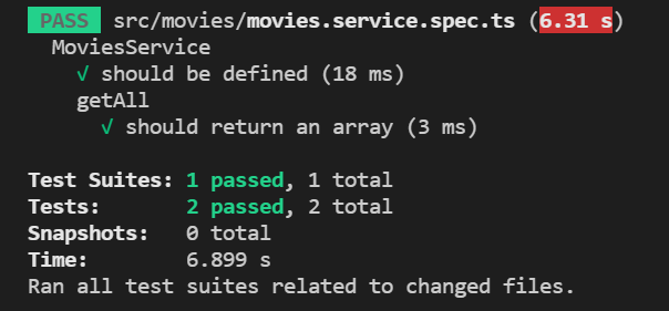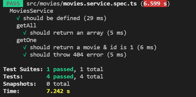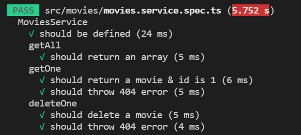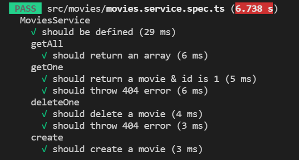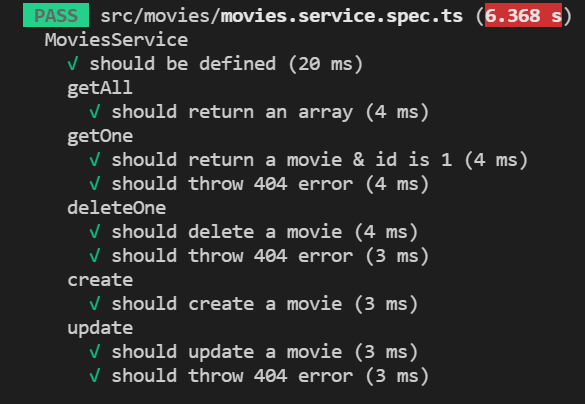 이로써 movies.service.ts에 있는 모든 함수들을 테스팅해보았고, 그 결과 coverage가 100%가 된 것을 확인할 수 있다 ~~
