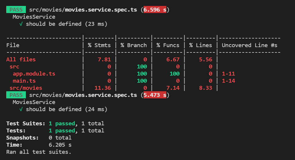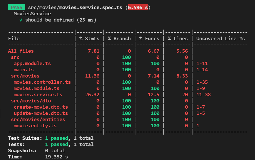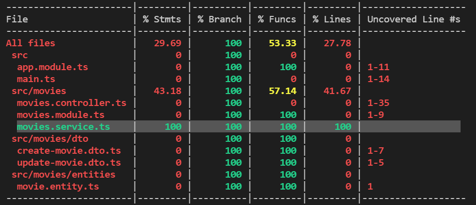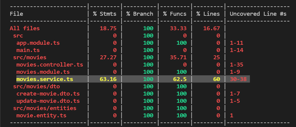 그리고 지금 npm run test:cov를 해보면, movies.service.ts에 대한 테스트 비율이 높아진 것을 확인할 수 있다.