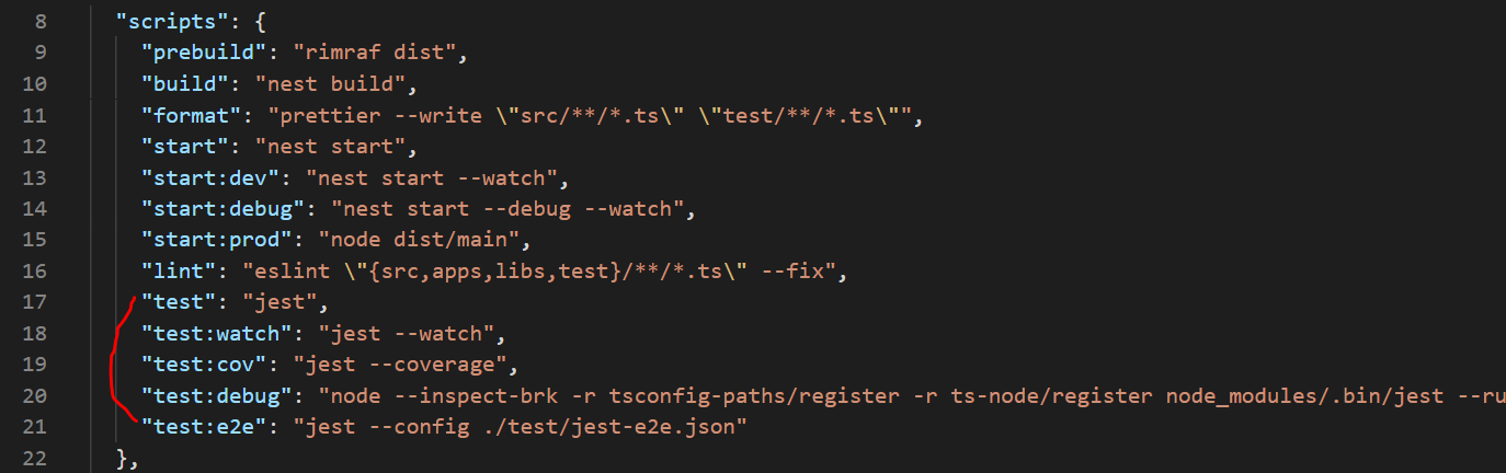 package.json 파일을 보면 테스팅과 관련된 스크립트가 5개 정도 있다.