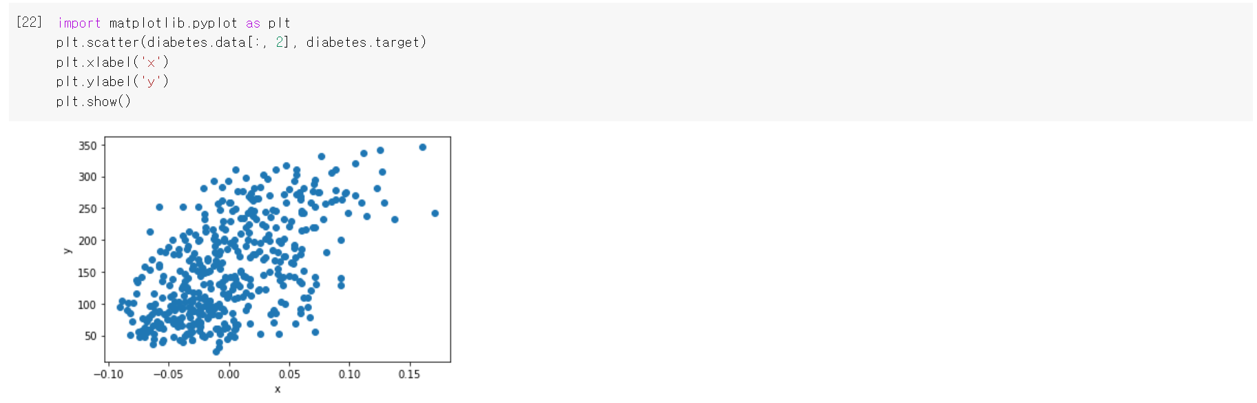 당뇨병 데이터 세트에는 10개의 특성이 있으므로 이 특성을 모두 그래프로 표현하려면 3차원 이사으이 그래프를 그려야 한다. 그러나 3차원 이상의 그래프를 그릴 수 없으므로 1개의 특성만 사용하여 그래프를 그리자.