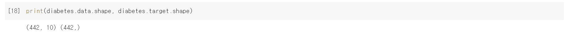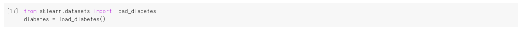 - 사이킷런의 datasest 모듈에 있는 load_diabetes() 함수를 import한 후 매개변수 없이 함수를 호출