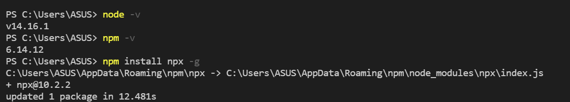 본격적으로 시작하기 전에 node js, npm, npx가 설치되어야 한다. 나는 node js와 npm이 설치되어 있으므로 npx만 추가적으로 설치해주었다. ( git은 당연하니까 언급만 하고 skip...~ )